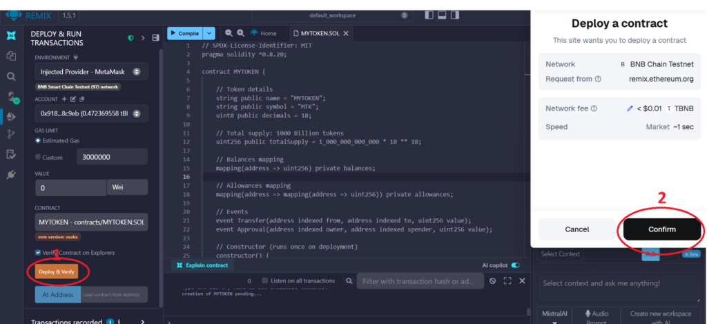 Here you have to click on Deploy & Verify it will sent a transaction request on your metamask wallet , simply confirm it. It will charge you a deployment fee approx 0.01 BNB .
